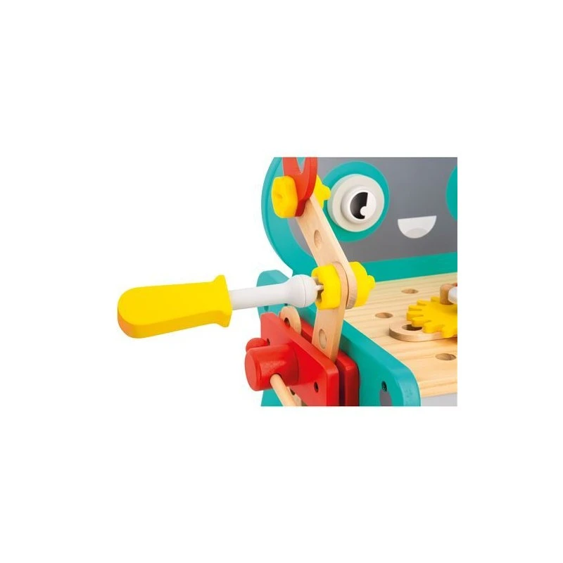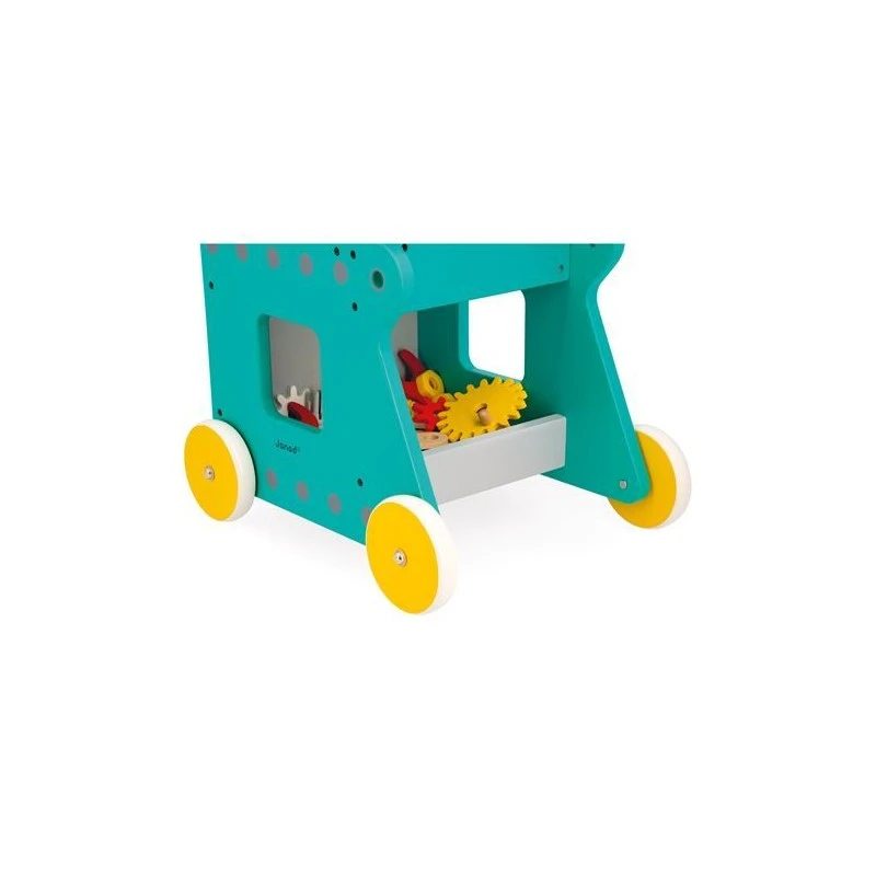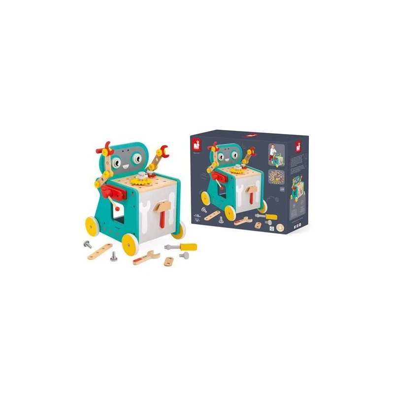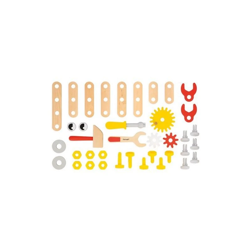 Le chariot de bricolage en bois Ă pousser robot Brico’Kids de Janod est livrĂ© avec 38 accessoires en bois et en plastique : plaquettes, engrenages, vis, Ă©crous, clous…