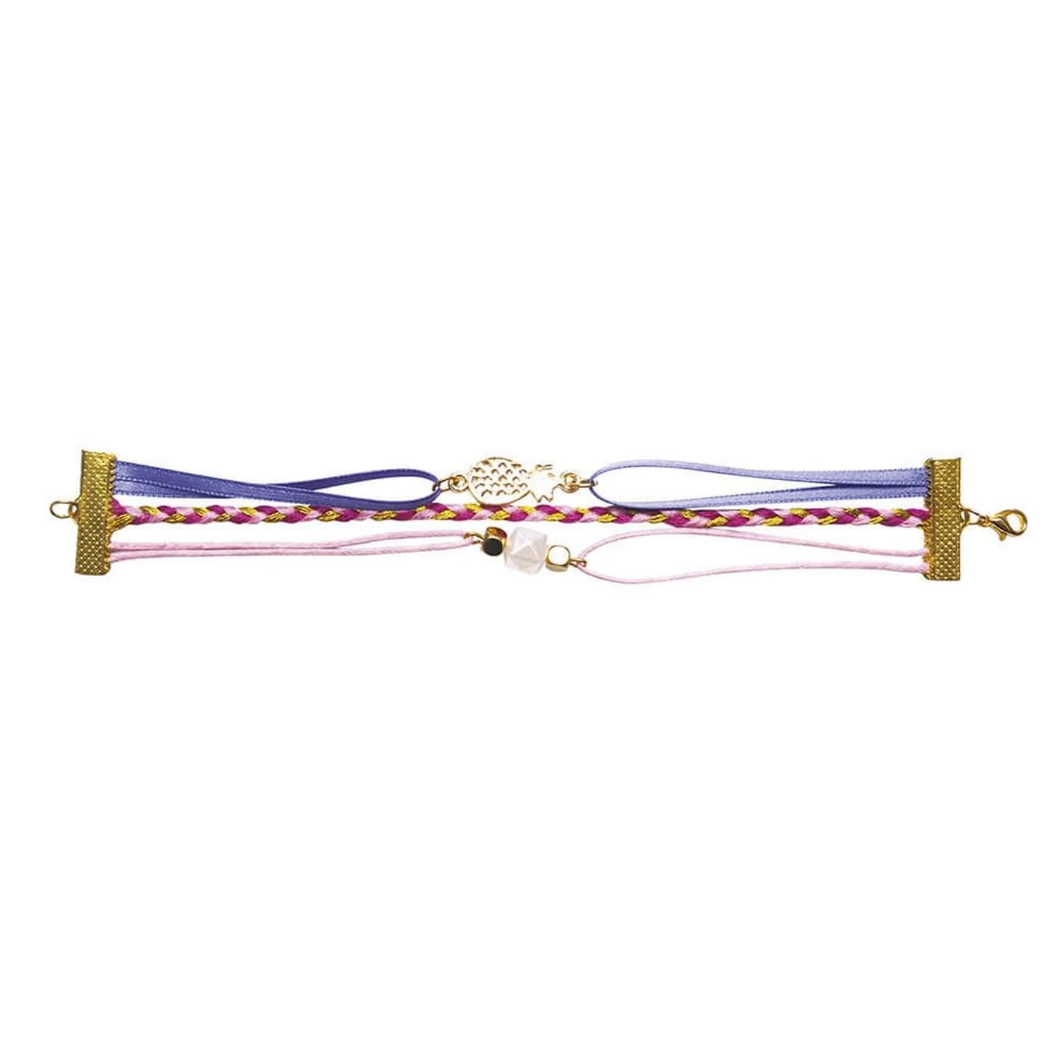 Tu as toujours eu envie de créer tes propres bracelets mais tu ne sais pas comment t’y prendre ? Pas de panique, il suffit de suivre le livret d’instructions pour créer les bracelets pas à pas. Tu vas pouvoir fabriquer 1 bracelet à 4 rangs rose, doré et bleu avec une breloque coquillage et 1 bracelet à 3 rangs rose, violet et doré avec une breloque ananas.