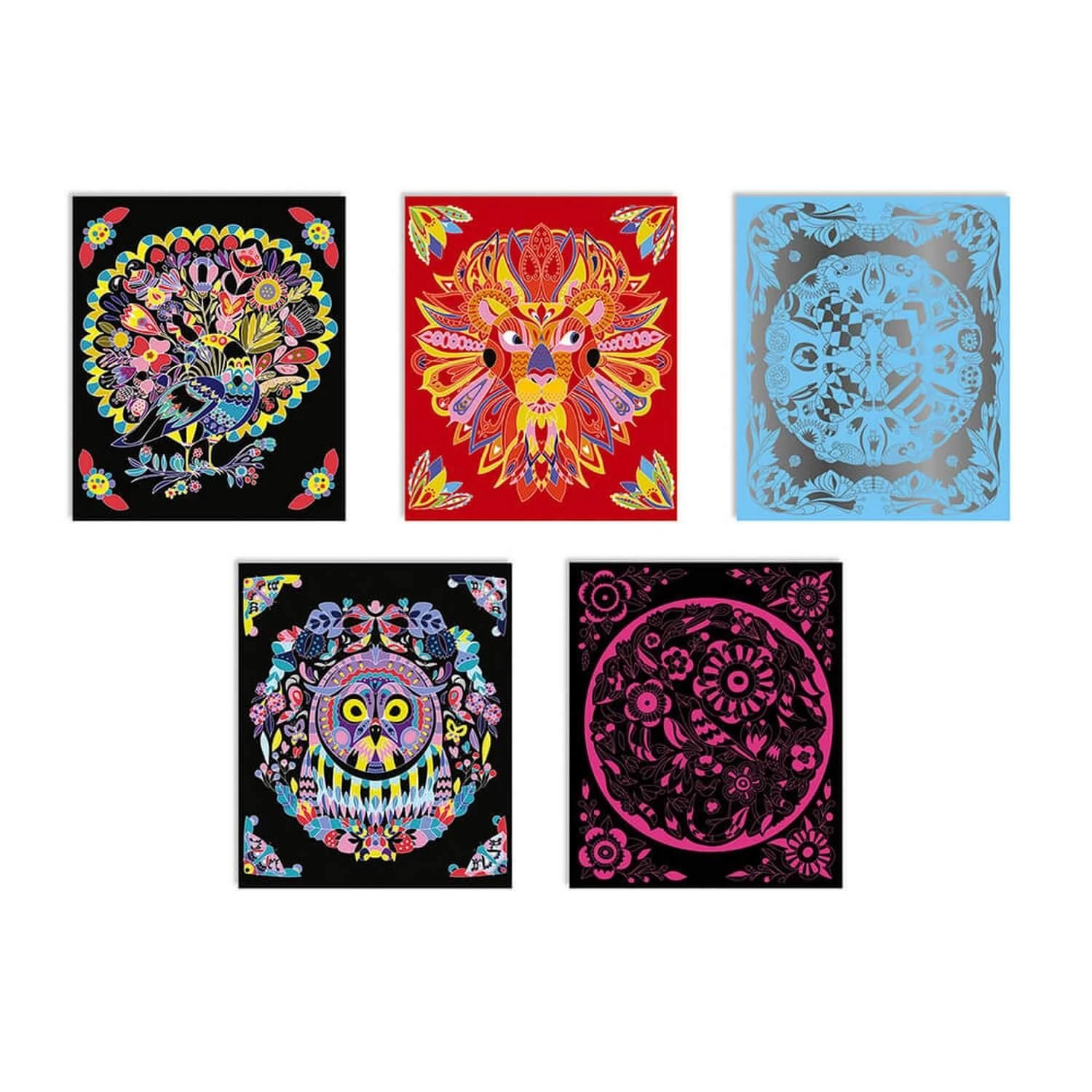 – 8 tableaux à gratter ( 4 noirs, 2 violets, 2 bleus) avec un effet phosphorescent
