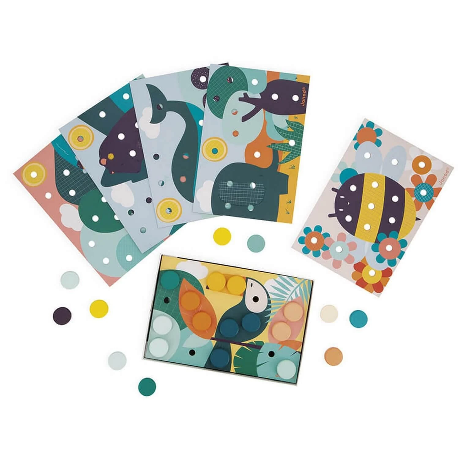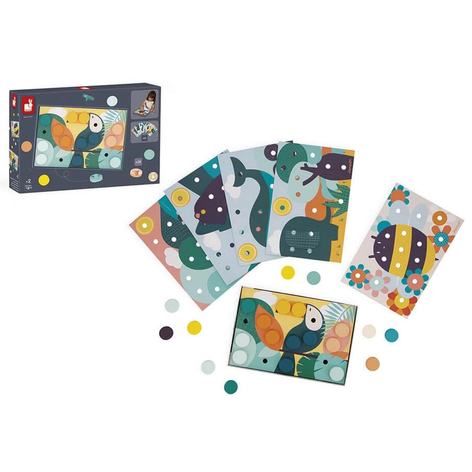 Le petit plus : la boîte sert de support pour les cartes, les enfants peuvent ainsi s’amuser en toute simplicité. Avec leur design doux et tendance, ces cartes à orner de mosaïques seront parfaites pour un temps calme avec bébé.