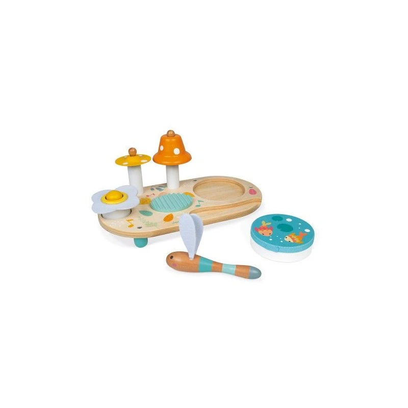Les petits musiciens en herbe vont adorer jouer avec cette jolie table musicale en bois composĂ©e d’une cymbale, d’une cloche, d’un grattoir, d’un pouet-pouet et d’un tambourin amovible.